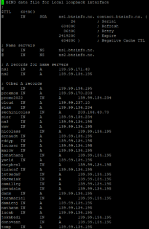 Maintenant, il faut accéder au fichier de zones avec la commande: sudo nano /etc/bind/zones/db.btsinfo.nc