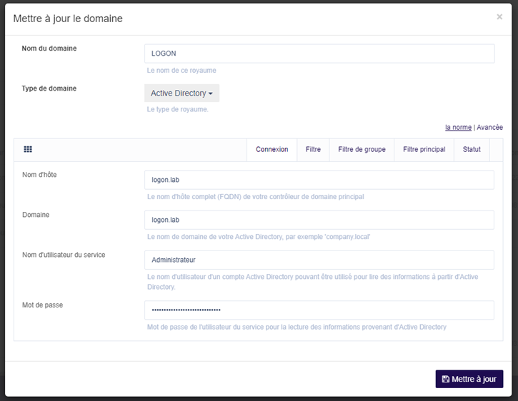 Pour que LogonBox mette en lien mon AD et sa base de données afin d’intégrer tous les utilisateurs de l’AD a logonbox, il faut configurer la base de données comme expliqué ci-dessus.
