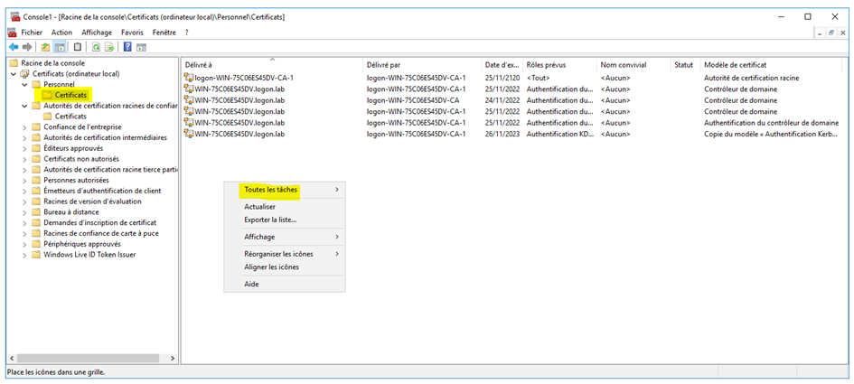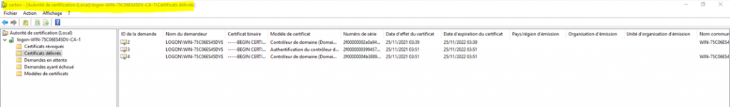 Après avoir suivi l’installation des rôles des services de certificats, voici comment délivrer un certificat :
