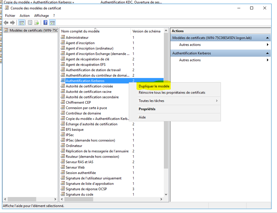 Etape 3 : Choisir Authentification Kerberos, faire un clic droit sur celui-ci et « dupliquer le modèle »