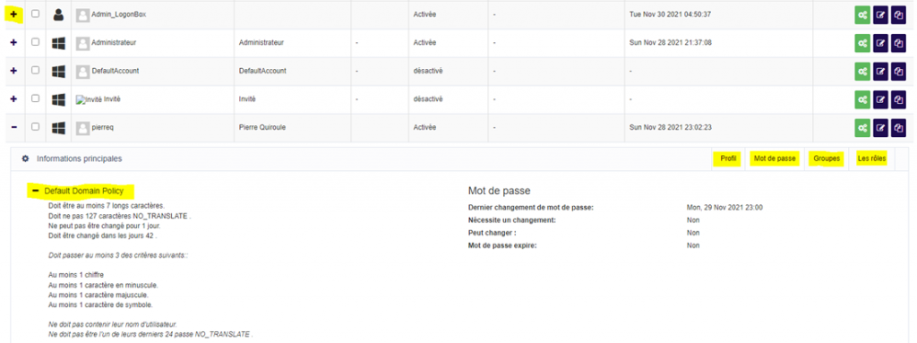Le « + » permet de voir les informations de l’utilisateurs comme les caractères obligatoires du mot de passe, si la configuration de son profil est terminée (questions + épingle), à quel groupe il appartient ainsi que le rôle qu’il occupe.