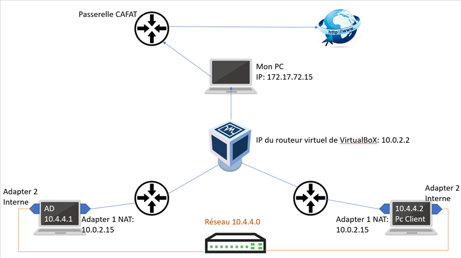 Ainsi, mon réseau « logon.lab 10.4.4.0 » est privé et « l’adapter NAT » permet aux machines de communiquer avec internet.