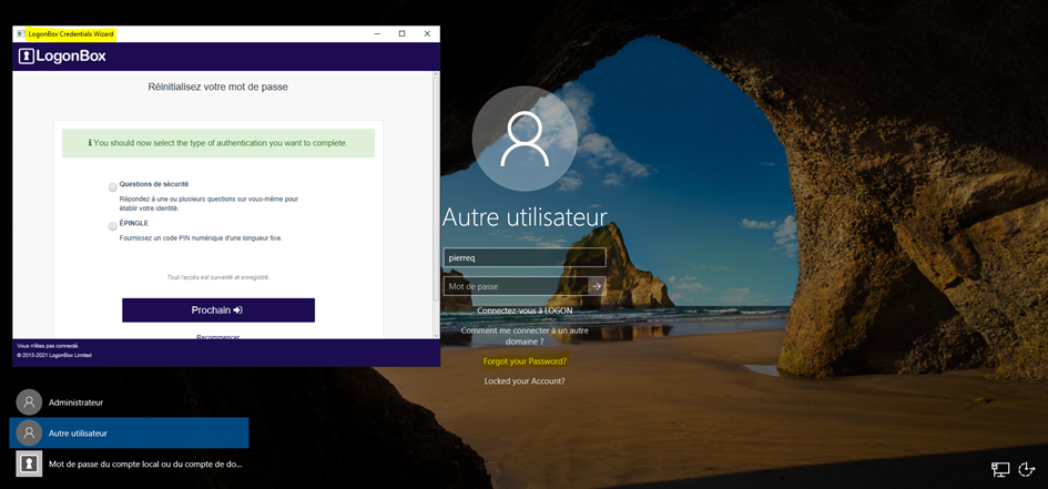 Une fois le compte configuré, l’utilisateur pourra réinitialiser son mot de passe ou débloquer son compte via LogonBox mais aussi via l’écran de connexion Windows :