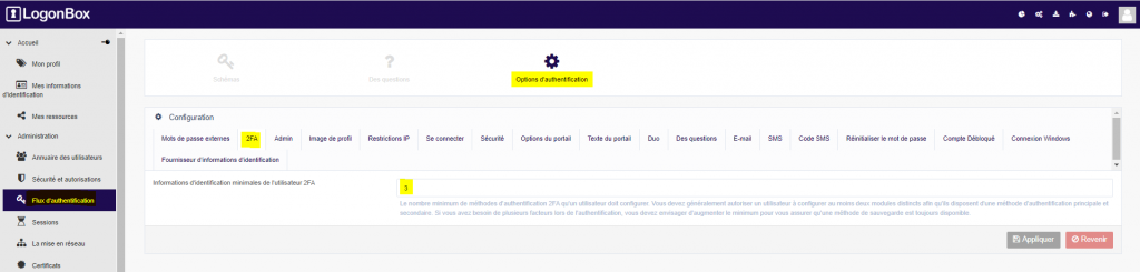 Attention, si vous choisissez d’instaurer plusieurs modes d’identification il faut changer la valeurs du nombre minimum de méthodes d’identification: